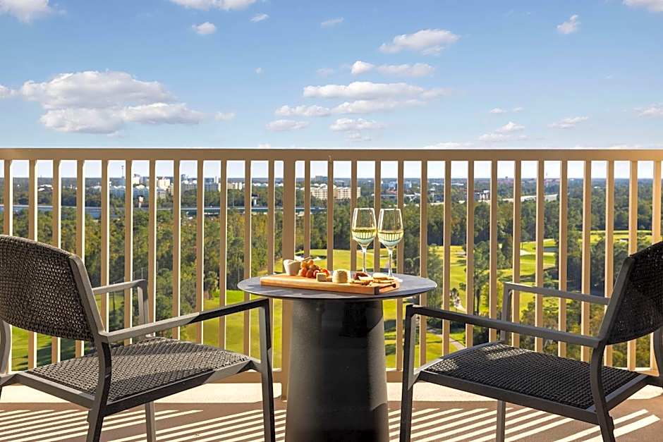 This suite has a balcony with a Disney view. A living room with a sofa bed, 3-person dining area, and wet bar with a wine refrigerator are also included. An Italian marble bathroom and a 42-inch flat-screen TV are also included.